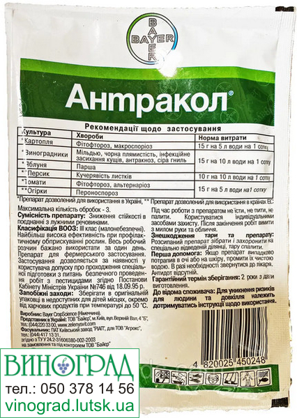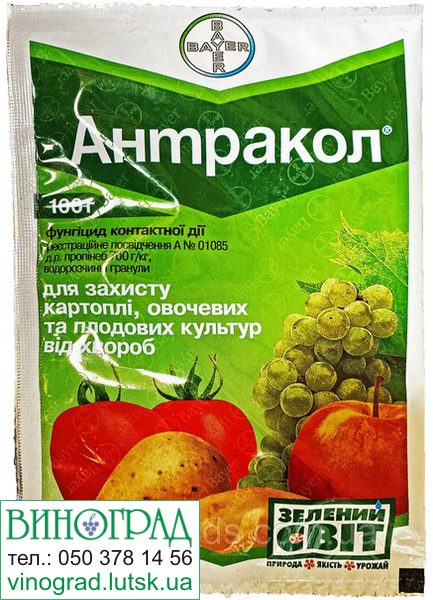 Антракол - є незамінним препаратом проти грибкових захворювань на овочевих та плодових культурах. Ефективний у боротьбі з кучерявістю листя персика, фітофторозом і альтернаріозом томатів і картоплі, мілдью, чорною плямистістю та сірою гниллю виноградників.