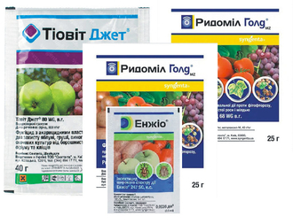 Бакова суміш №1 для обробки винограду (2шт. Ридоміл Голд 25г Фунгіцид + 1шт. Тіовіт Джет 80 WG 40 г Фунгіцид + 1шт. Енжіо 3,6мл Інсектицид на 10л води)