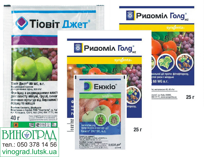 Бакова суміш №1 для обробки винограду: 2шт. Ридоміл Голд 25г Фунгіцид + 1шт. Тіовіт Джет 80 WG 40 г Фунгіцид + 1шт. Енжіо 3,6мл Інсектицид на 10л води