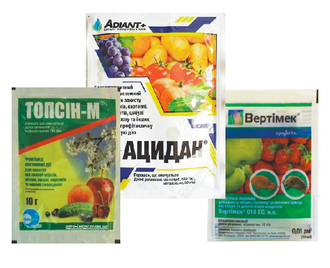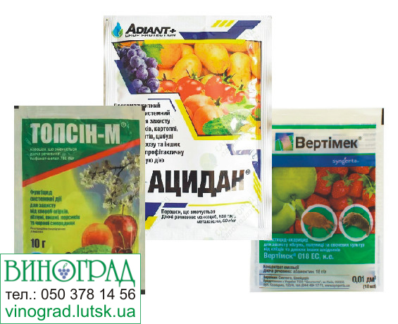 Бакова суміш №3 для обробки винограду: 1шт. Ацидан 25г Фунгіцид + 1шт. Топсін-М 10 г Фунгіцид + 1шт. Вертімек 018 ЄС 10 мл Інсектицид Акарицид на 10л води