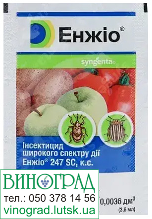 Енжіо — новий системно-контактний, надзвичайно потужний інсектицид, який містить дві діючі речовини. Препарат має широкий спектр знищуваних шкідників та побічну дію на дорослі стадії кліщів. На відміну від інших інсектицидів, ефективно діє при підвищених і низьких температурах та в посушливих умовах. Захисний період — більше як 20 днів. Контактна діюча речовина — лямбда-цигалотрин — проникає через кутикулу шкідників, спричиняючи їх швидку загибель. Системна діюча речовина — тіаметоксам — протягом години потрапляє в рослину, де накопичується в точках росту, забезпечуючи тривалий захист усієї рослини. Застосування: упаковку (3,6 мл) розвести в 10 л води і приготувати робочий розчин.