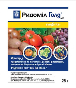 Фунгіцид Ридоміл Голд — контактно-системний препарат, який дозволяє захистити рослини від грибкових захворювань. Ридоміл Голд застосовується як для профілактики, так і для лікування інфікованих рослин. Найбільш ефективно використання фунгіциду на початкових стадіях захворювання (не більше 5% поразки). Препарат призначений для обприскування надземної частини рослини. Діючі речовини — манкоцеб та металаксилу.
