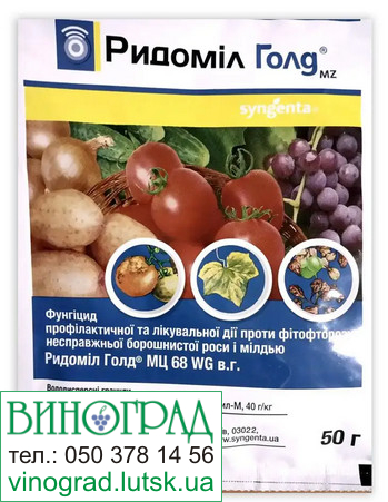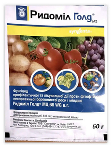 Фунгіцид Ридоміл Голд — контактно-системний препарат, який дозволяє захистити рослини від грибкових захворювань. Ридоміл Голд застосовується як для профілактики, так і для лікування інфікованих рослин. Найбільш ефективно використання фунгіциду на початкових стадіях захворювання (не більше 5% поразки). Препарат призначений для обприскування надземної частини рослини. Діючі речовини — манкоцеб та металаксилу.