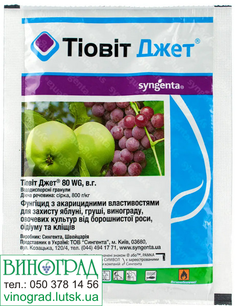 Фунгіцид Тіовіт Джет з акарицидними властивостями компанії Сінгента застосовується для обробки овочевих та плодових культур від комплексу грибкових та бактеріальних захворювань та для знищення рослиноїдних кліщів. Діюча речовина фунгіциду Тіовіт – сірка, – потрапляючи на поверхню рослини, пригнічує та зупиняє ріст патогенних спор грибів, а також перешкоджає появі та розвитку нових захворювань. Ефективність діючої речовини (сірки) даного препарату заснована на парах сірчаного ангідриду, що виділяються нею. При підвищених температурах довкілля утворюється ефект тривалої фумігації. Пара обволікає рослину і зупиняє розвиток грибка, не проникаючи при цьому всередину рослинних тканин. Молекули пари проникають у спори грибків і руйнують їх на клітинному рівні, попереджаючи їхню нову появу. При цьому фунгіцид має високу інсектицидну токсичність для боротьби з різними видами кліщів на рослинах. На відміну від аналога колоїдної сірки даний препарат повністю розчиняється у воді і не залишає осаду. Тіовіт Джет застосовується для обробки винограду, капусти, огірків, ріпаку, яблуні, груші, з метою профілактики та лікування від борошнистої роси, оїдіуму, кіли, а також від рослиноїдних кліщів.