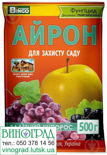 Залізний купорос Айрон - класичний фунгіцид покращеного дії (сульфат заліза високої якості), призначений для боротьби із збудниками хвороб рослин, знищення мохів, лишайників, спор грибків на плодових деревах, ягідних кущах і виноградній лозі до початку і після вегетації. Залізо бере безпосередню участь в утворенні хлорофілу, тому Айрон є прекрасним засобом для лікування і профілактики хлорозу.
